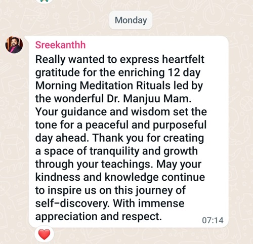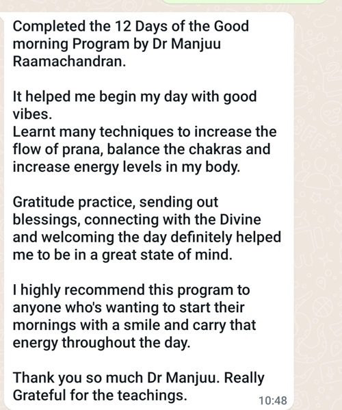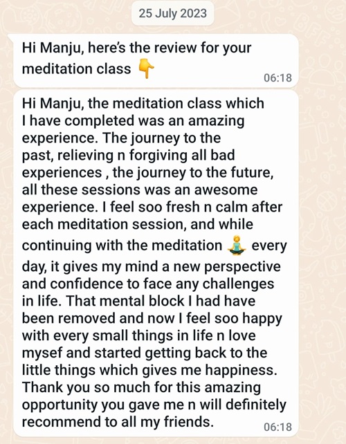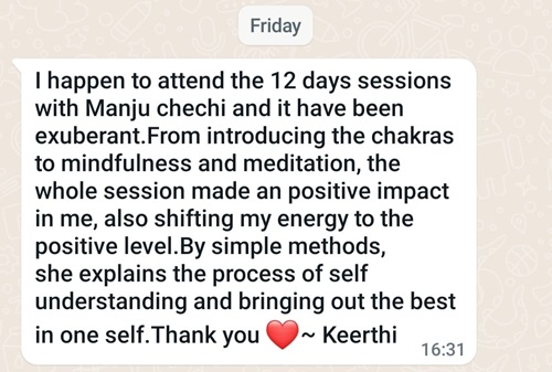 Before I met Dr. Manju R, I was going through a very dark phase in my life. I was filled with tons of grief, resentment and fear. My heart chakra was totally blocked after my father's death. There was a wall around it which made it difficult to connect with people.I was almost dead. But when I first met her, I was completely moved by her loving energy.